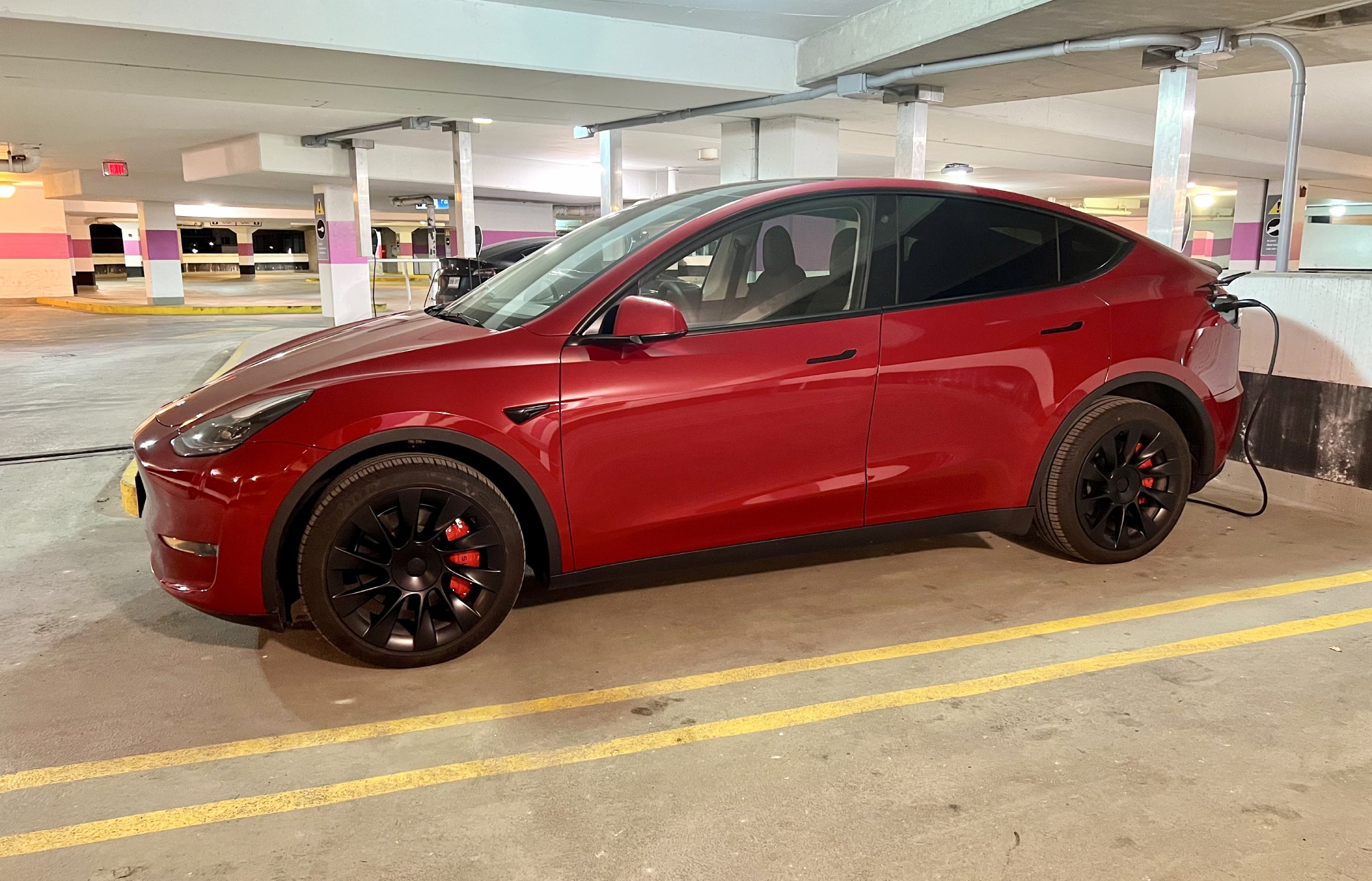 Both the original 2020-2025 Model Y and the refreshed “Juniper” 2026+ Model Y are capable of charging at 48 amps (11 kW) at home through the integrated NACS port in the driver-side tail light. Battery capacity ranges from 60 to 84 kWh depending on trim and year.