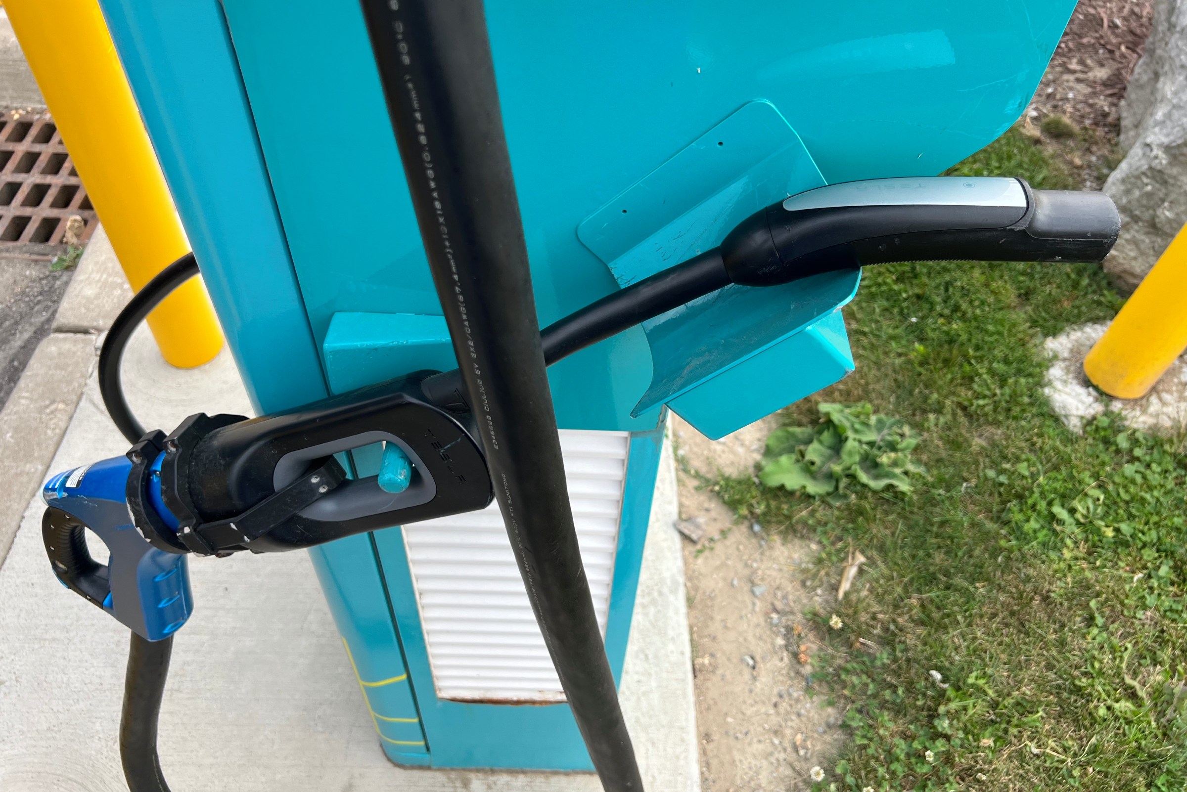 The Ivy network initially had CCS and CHAdeMO connectors at their stations, leaving Tesla drivers out in the cold. However, Ivy was recently installing adapters to convert the old CHAdeMO connectors to Tesla (NACS) connectors, allowing Tesla drivers to plug in. The caveat though, is that it’s still using the CHAdeMO electronics, so the charging rate is limited to only 50 kW, while the CCS connectors at the same location will deliver 100 or 150 kW.